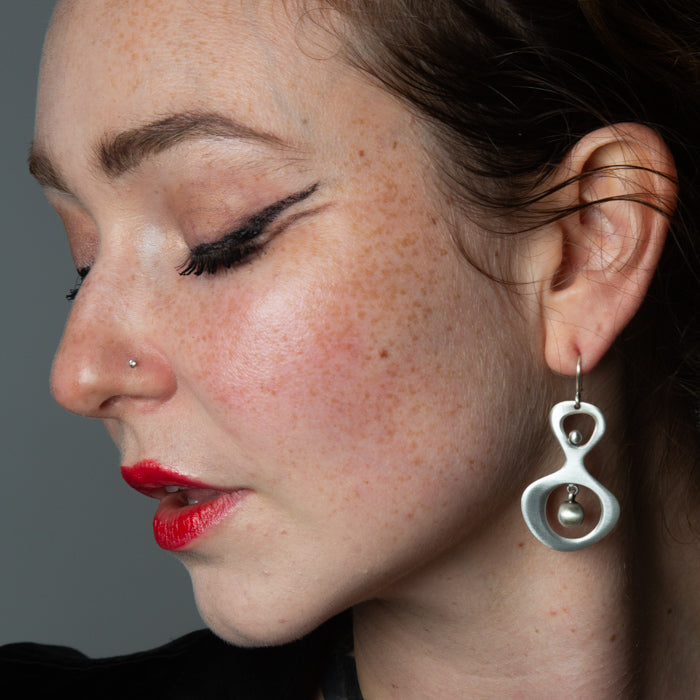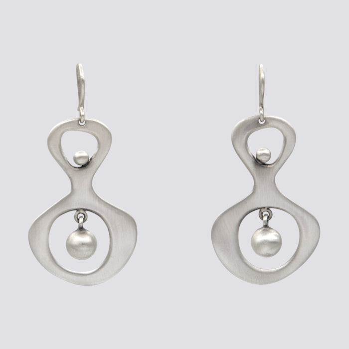 Abstract earrings with granulation and ball dangle. Fun mid century modern styling, beautiful craftsmanship.