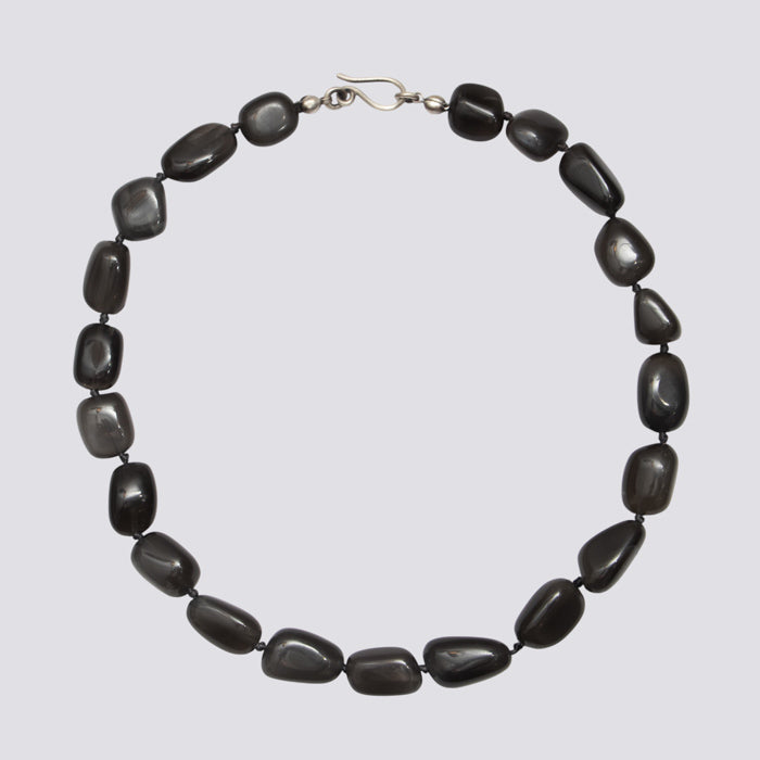 Dark grey moonstone necklace with sterling silver clasp. Hand knotted on silk. Classic.