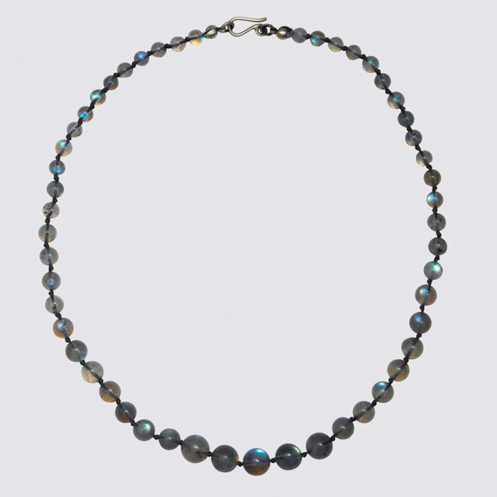 Knotted graduated labradorite necklace with sterling silver clasp. Hand knotted on silk.