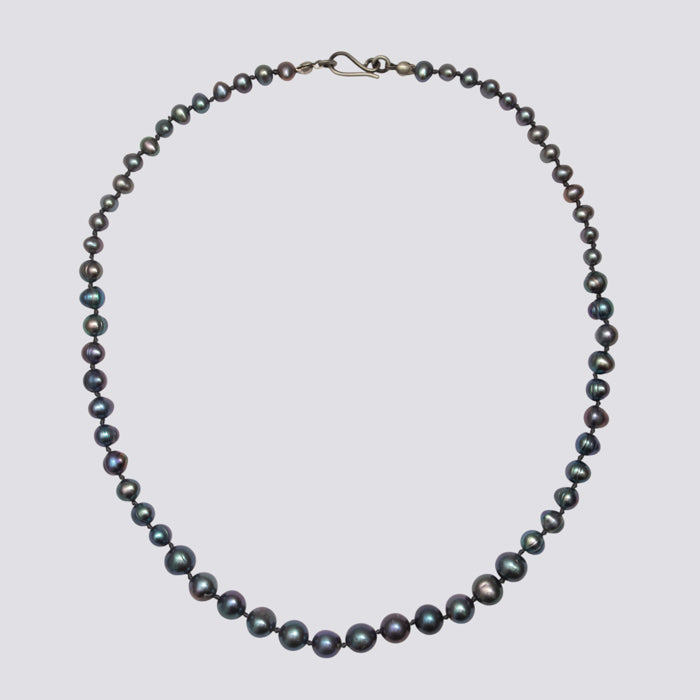 Graduated grey freshwater pearl necklace with sterling silver clasp. Hand knotted on silk. Classic.