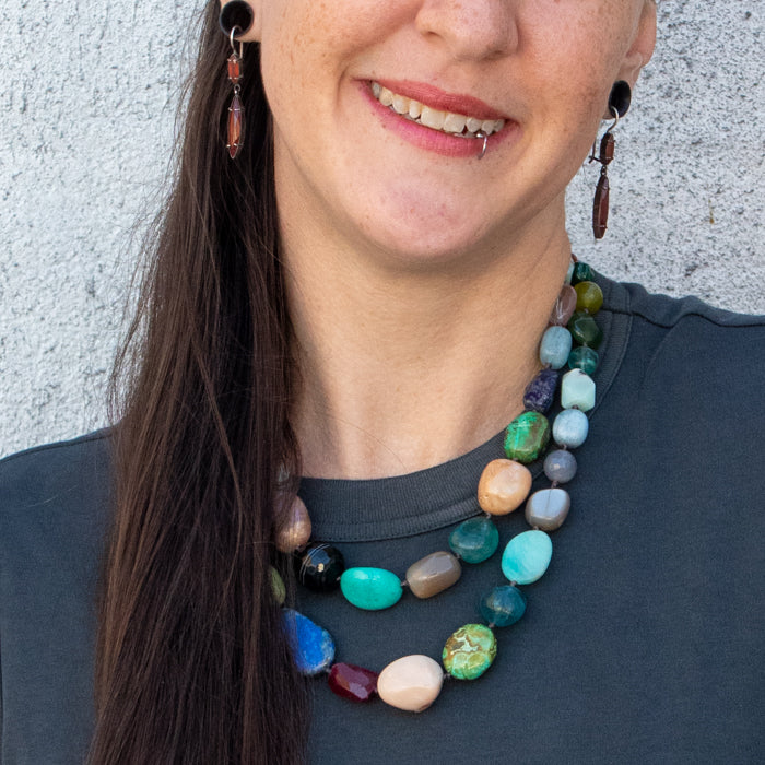 Multi stone necklace with sterling silver clasp. Hand knotted on silk.