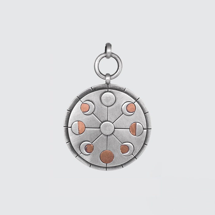 Large round silver pendant with copper inlay, depicting the phases of the moon and the mysteries of the natural world.