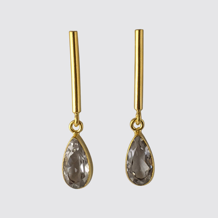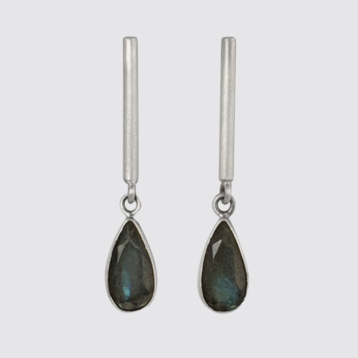 Vertical bar stud with swinging bezel set faceted stone tear drops. Contemporary, casual, interesting and pretty!