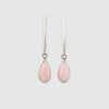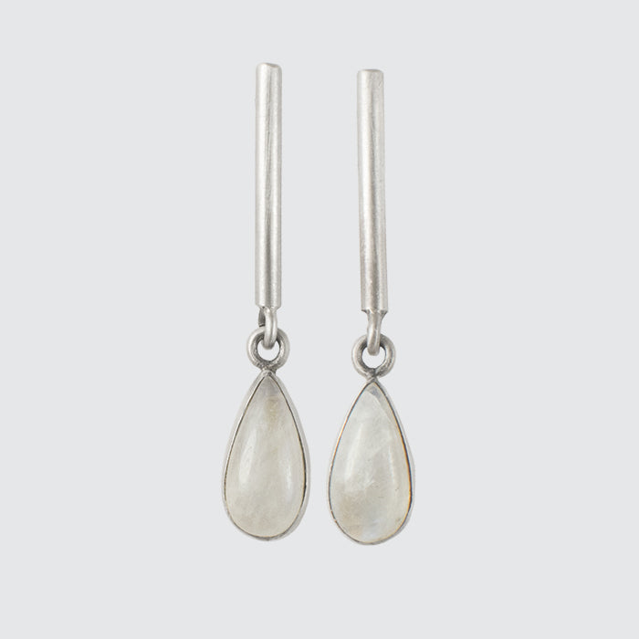Vertical bar stud with swinging bezel set cabochon stone tear drops. Contemporary, casual, interesting and pretty!