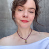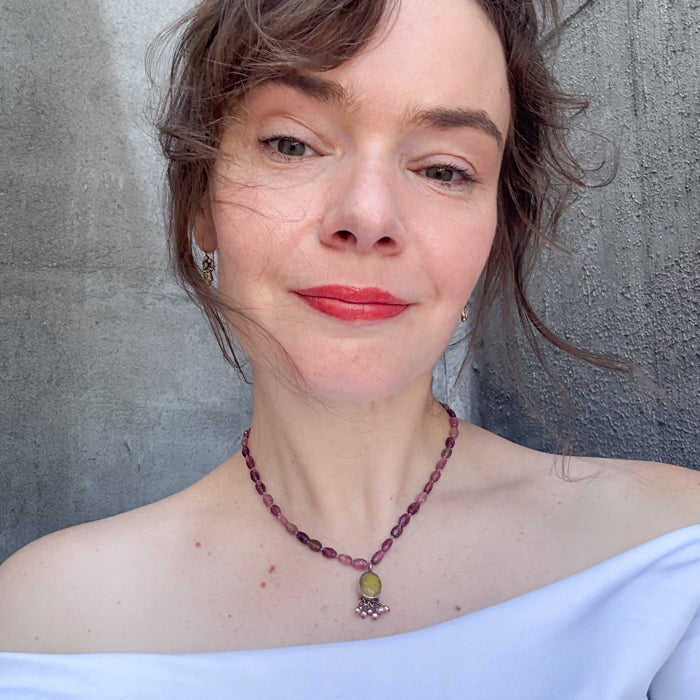 Pink tourmaline and yellow jade necklace with pearl dangles and 10K rose gold. Hand knotted on silk.
